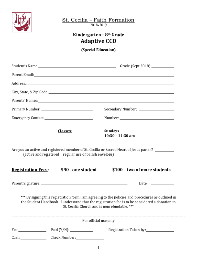 St. Cecilia Faith Formation 20182019Kindergarten 8th GradeAdaptive CCD (Special Education)Students Name:Grade (Sept 2018):Parent Email: Address: City, State, & Zip Code: Parents Names: Primary Number:Secondary