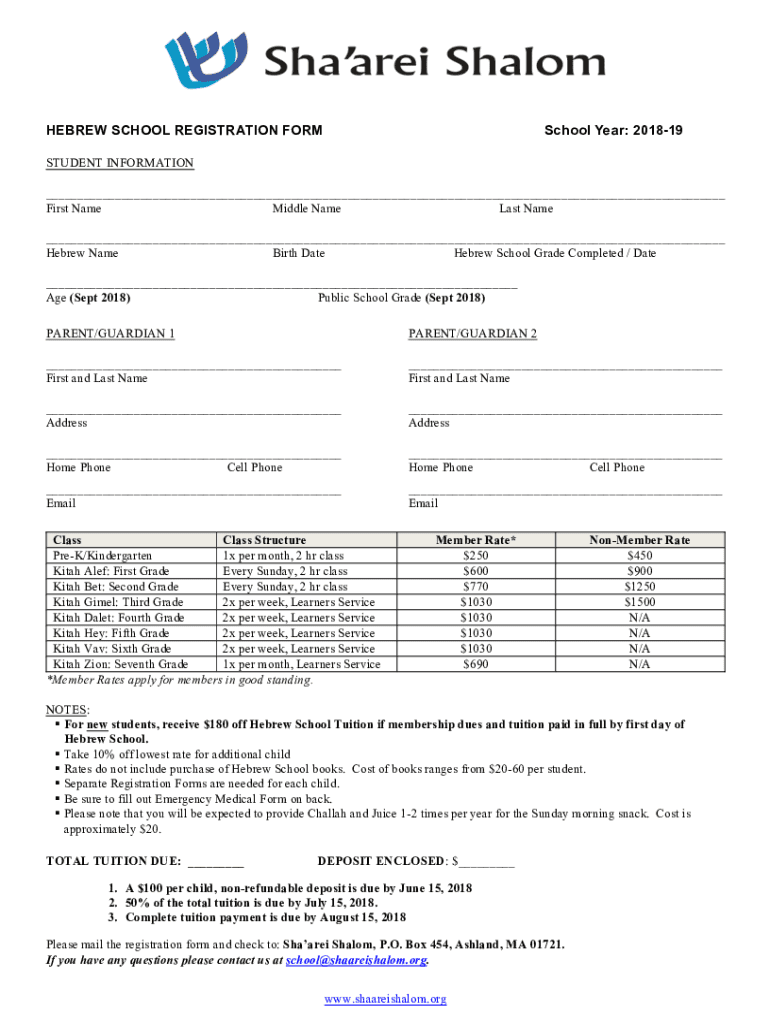School Year: 201819HEBREW SCHOOL REGISTRATION FORM STUDENT INFORMATION First Name Middle Name Last Name Hebrew Name Birth Date Hebrew School Grade Completed / Date Age (Sept 2018) Public School Grade