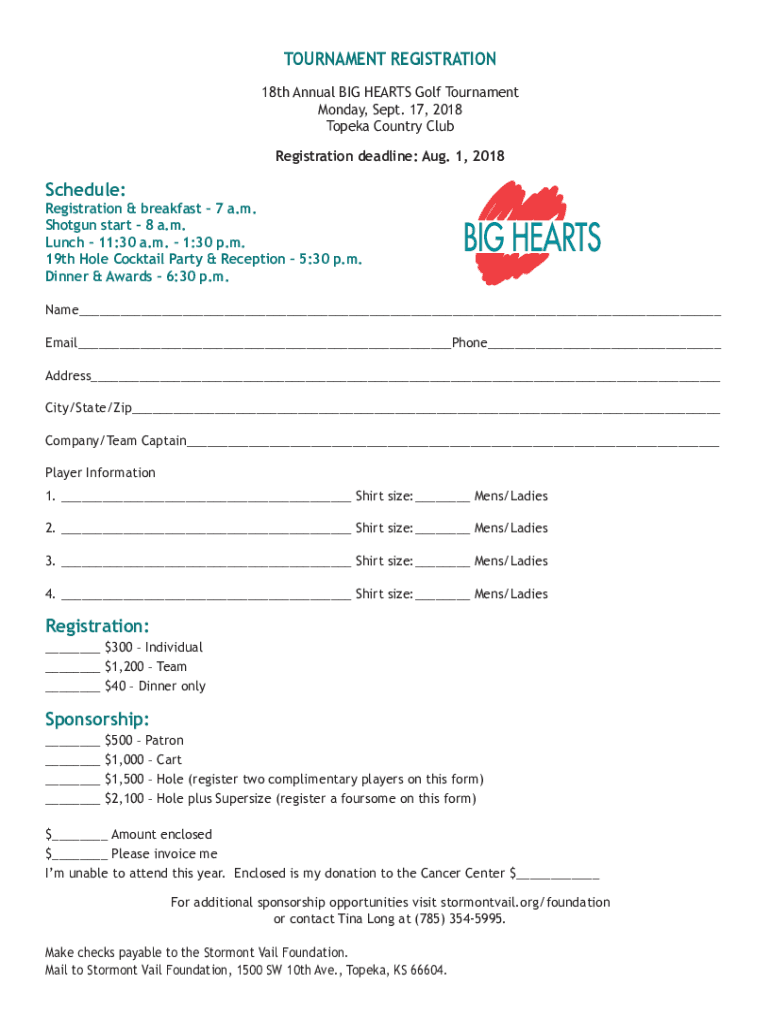 TOURNAMENT REGISTRATION 18th Annual BIG HEARTS Golf Tournament Monday, Sept. 17, 2018 Topeka Country Club Registration deadline: Aug. 1, 2018Schedule:Registration & breakfast 7 a.m. Shotgun start