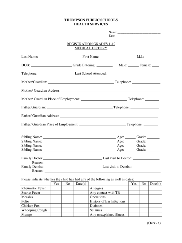 THOMPSON PUBLIC SCHOOLS HEALTH SERVICES Name: Date: REGISTRATION GRADES 112 MEDICAL HISTORY Last Name: First Name: M.I.: DOB: Grade Entering: Male: Female: Telephone: Last School Attended: Mother/Guardian: