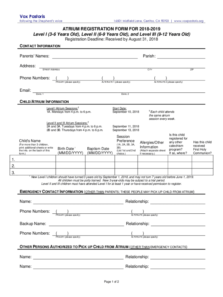 Vox Pastors following the Shepherd's voice16501 Midfield Lane, Burritos, CA 90703 www.voxpastoris.orgATRIUM REGISTRATION FORM FOR 20182019 Level I (36 Years Old), Level II (69 Years Old), and Level