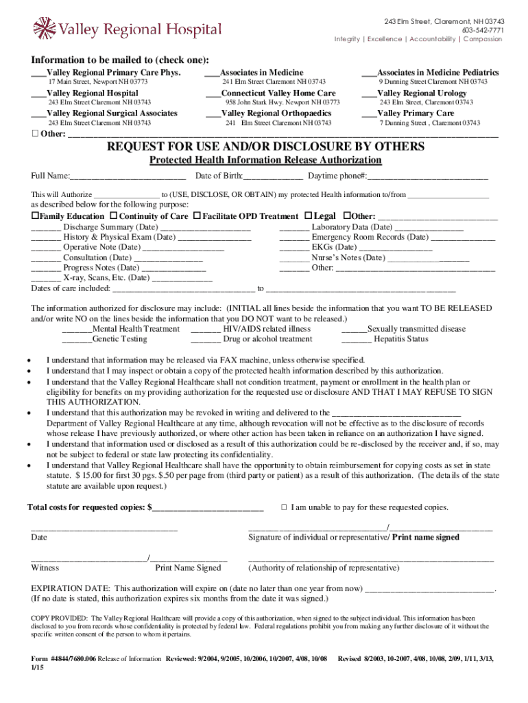 243 Elm Street, Claremont, NH 03743 6035427771 Integrity Excellence Accountability CompassionInformation to be mailed to (check one): Valley Regional Primary Care Phys. Associates in Medicine 17 Main