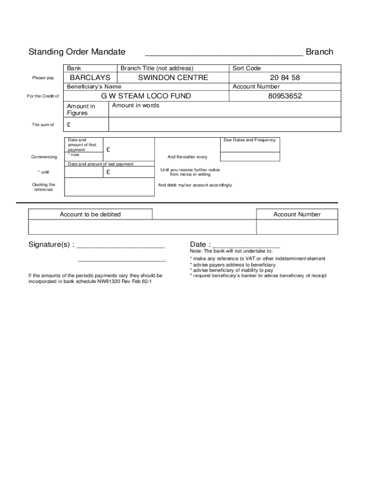 Standing Order Mandate Bank Please pay Branch Title (not address)BARCLAYSSort CodeSWINDON CENTRE20 84 58Beneficiarys NameAccount Number W STEAM LOCO Functor the Credit amount in Figures The sum ofCommencingDate