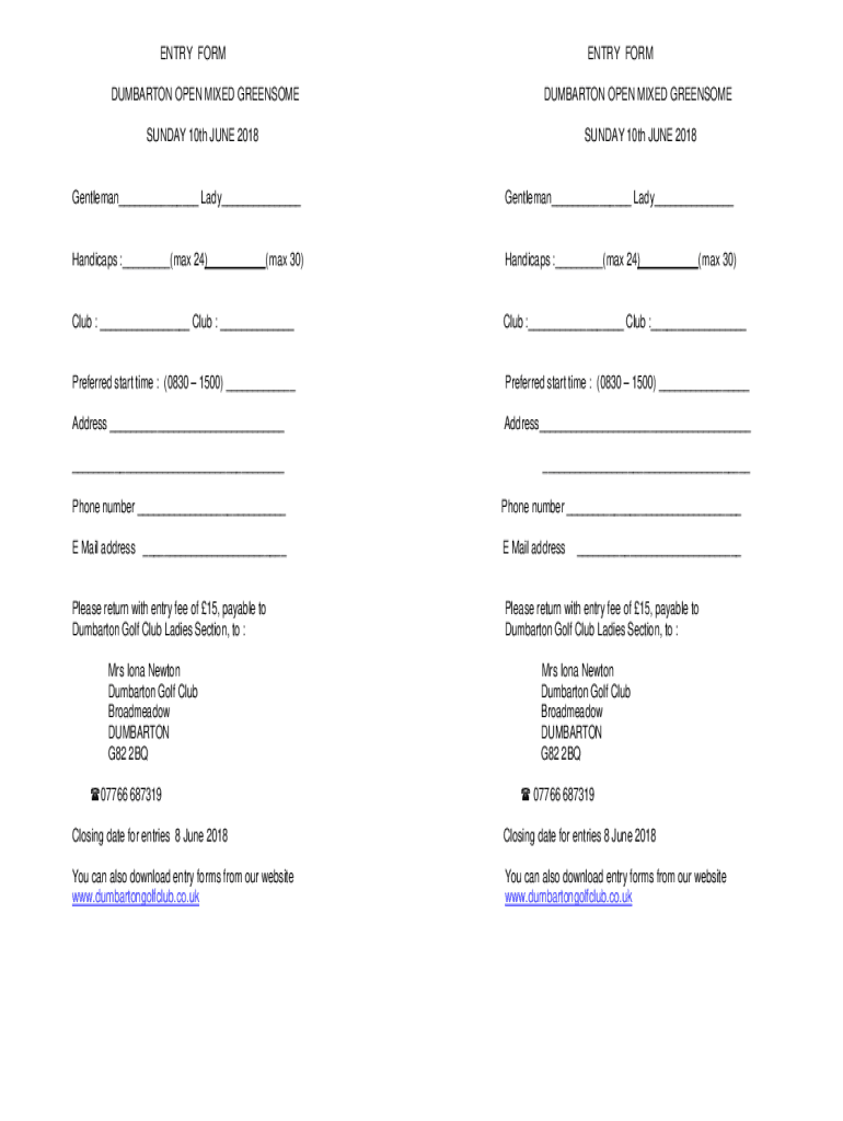 ENTRY FORESTRY FORMDUMBARTON OPEN MIXED GREENSOMEDUMBARTON OPEN MIXED GREENSOMESUNDAY 10th JUNE 2018SUNDAY 10th JUNE 2018Gentleman Lady Gentleman Lady Handicaps : (max 24)Handicaps : (max 24)(max