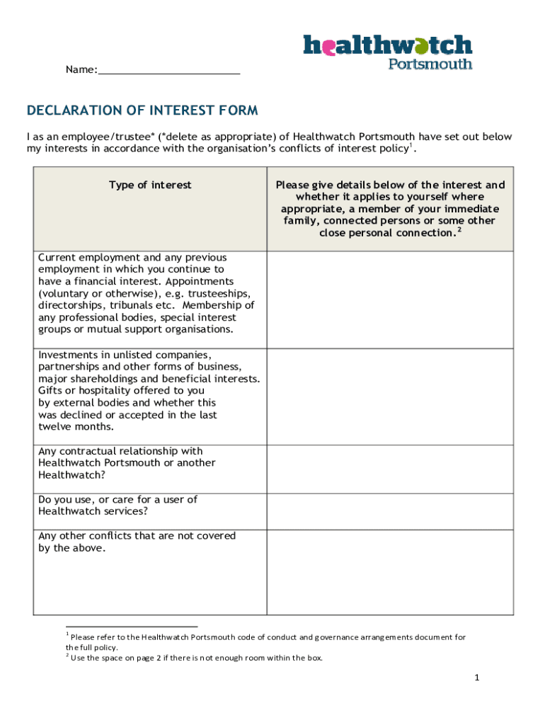 Name: DECLARATION OF INTEREST FORM I as an employee/trustee* (*delete as appropriate) of Health watch Portsmouth have set out below my interests in accordance with the organizations conflicts of interest