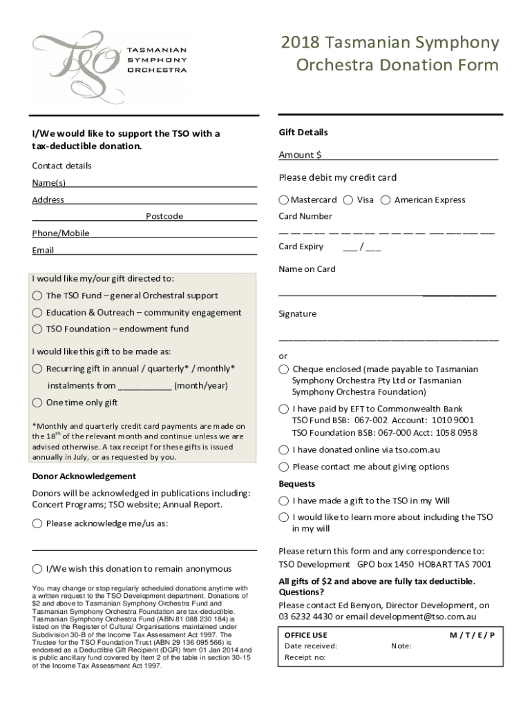 2018TasmanianSymphony OrchestraDonationForm I/WewouldliketosupporttheTSOwitha taxdeductibledonation. GiftDetails Amount ContactdetailsPleasedebitmycreditcardName(s) AddressMastercardVisaAmericanExpress