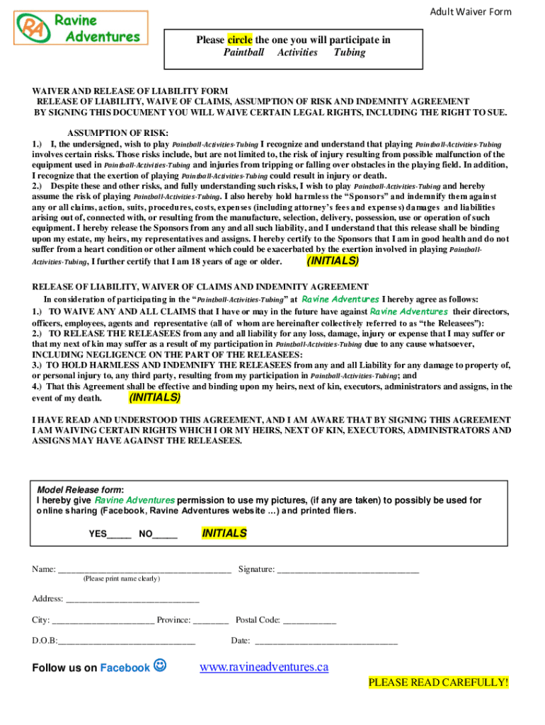 TubingWAIVER AND RELEASE OF LIABILITY FORM