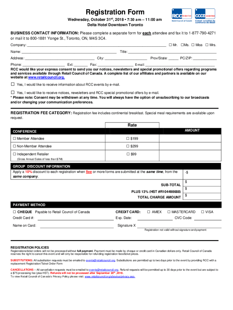 Registration Form Wednesday, October 31st, 2018 7:30 am 11:00 am. Delta Hotel Downtown Toronto BUSINESS CONTACT INFORMATION: Please complete a separate form for each attendee and fax it to 18777904271