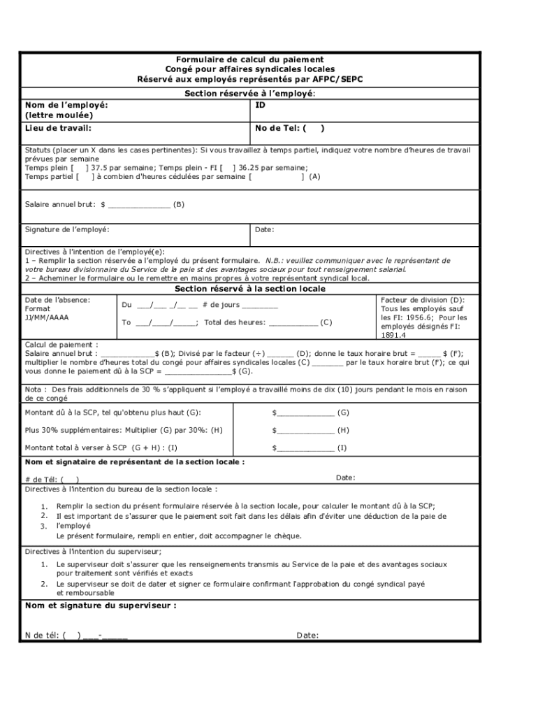 Formula ire DE calculi Du pavement Cong pour affairs syndicates locales Serve aux employs represents par AFC/SEPT Section serve employ: Idiom DE employ: (letter module) Lieu DE travail:No de Tel: