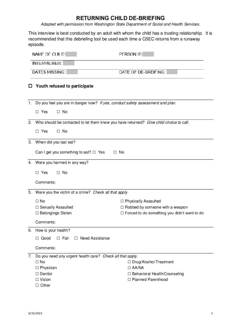 RETURNING CHILD DEBRIEFING Adapted with permission from Washington State Department of Social and Health Services. This interview is best conducted by an adult with whom the child has a trusting relationship.