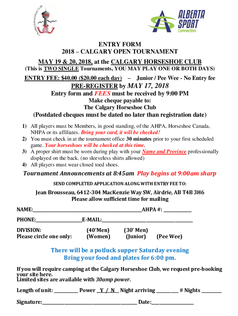 ENTRY FORM 2018 CALGARY OPEN TOURNAMENT MAY 19 & 20, 2018, at the CALGARY HORSESHOE CLUB (This is TWO SINGLE Tournaments, YOU MAY PLAY ONE OR BOTH DAYS)ENTRY FEE: $40.00 ($20.00 each day) Junior /