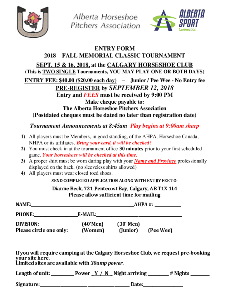 ENTRY FORM 2018 FALL MEMORIAL CLASSIC TOURNAMENT SEPT. 15 & 16, 2018, at the CALGARY HORSESHOE CLUB (This is TWO SINGLE Tournaments, YOU MAY PLAY ONE OR BOTH DAYS)ENTRY FEE: $40.00 ($20.00 each day)
