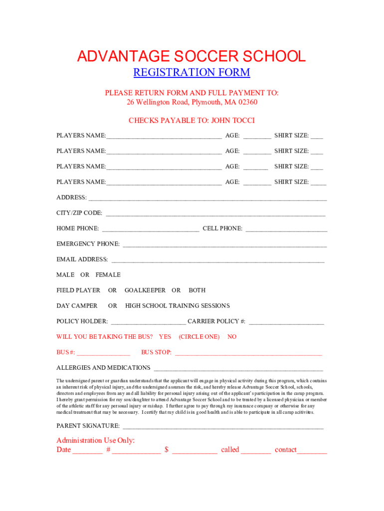 ADVANTAGE SOCCER SCHOOL REGISTRATION FORM PLEASE RETURN FORM AND FULL PAYMENT TO: 26 Wellington Road, Plymouth, MA 02360 CHECKS PAYABLE TO: JOHN COCCI PLAYERS NAME: AGE: SHIRT SIZE: PLAYERS NAME: