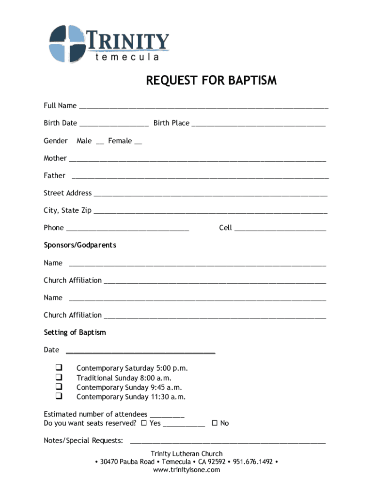 REQUEST FOR BAPTISM Full Name Birth Date birthplace Gender Male Female Mother Father Street Address City, State Zip Phone Cell Sponsors/Godparents Name Church Affiliation Name Church Affiliation Setting