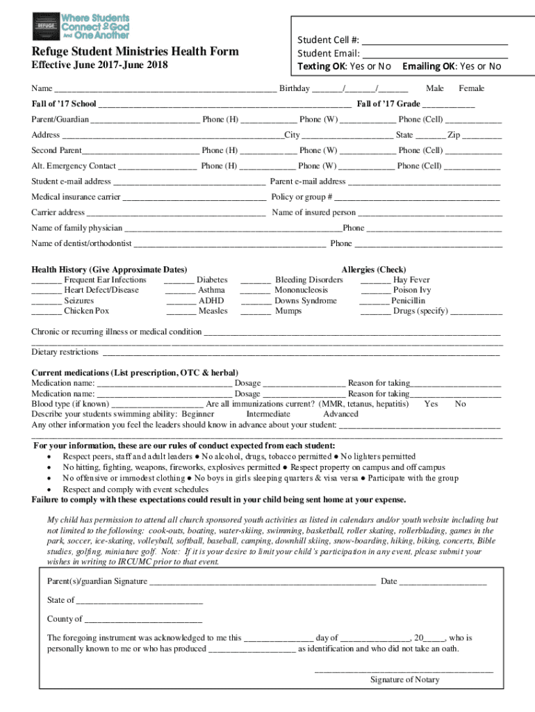 Refuge Student Ministries Health Form Effective June 2017June 2018Student Cell #: Student Email: Texting OK: Yes or No Emailing OK: Yes or Nonage Birthday / / MaleFemaleFall of 17 School Fall of 17
