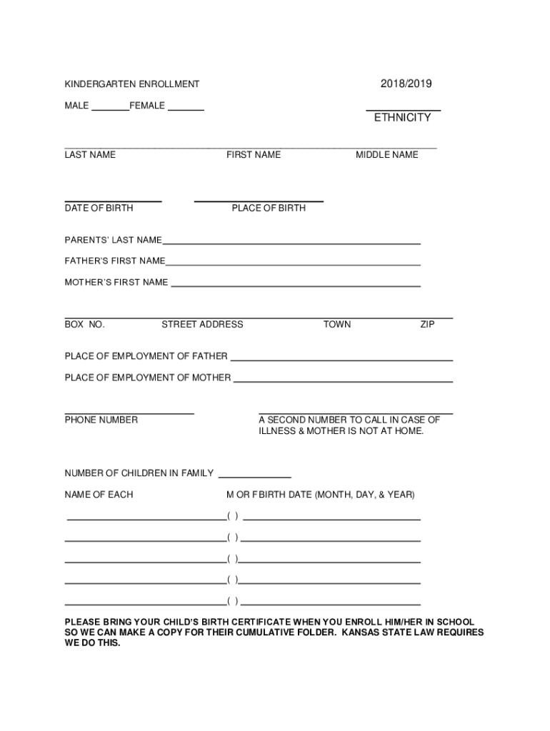 2018/2019KINDERGARTEN ENROLLMENT MALEFEMALEETHNICITY LAST NAMEFIRST NAMED ATE OF BIRTHMIDDLE NAMEPLATE OF BIRTHPARENTS LAST NAME FATHERS FIRST NAME MOTHERS FIRST NAME BOX NO.STREET ADDRESSTOWNZIPPLACE