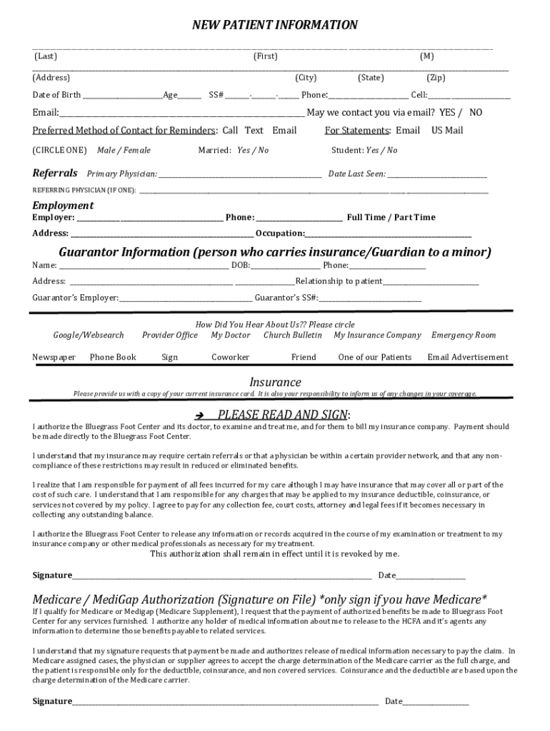 Get the free PDF NEW PATIENT INFORMATION - Bluegrass Foot Centers