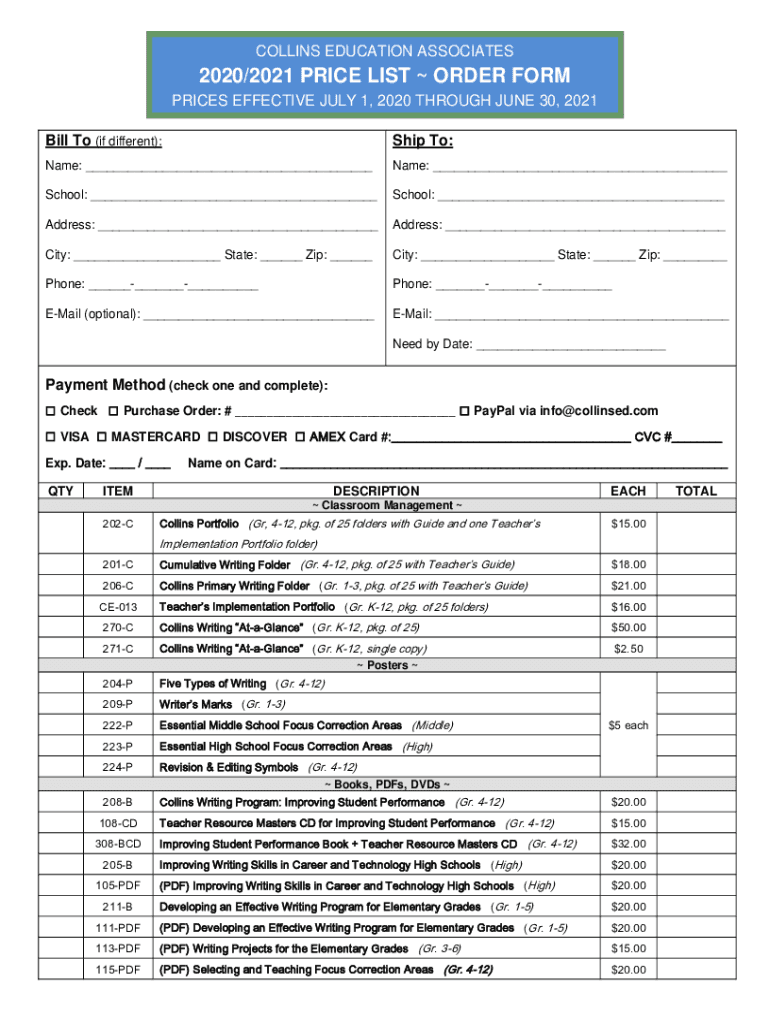COLLINS EDUCATION ASSOCIATES2020/2021 PRICE LIST ORDER FORM PRICES EFFECTIVE JULY 1, 2020, THROUGH JUNE 30, 2021, Bill To (if different):Ship To:Name: Name: School: School: Address: Address: City:
