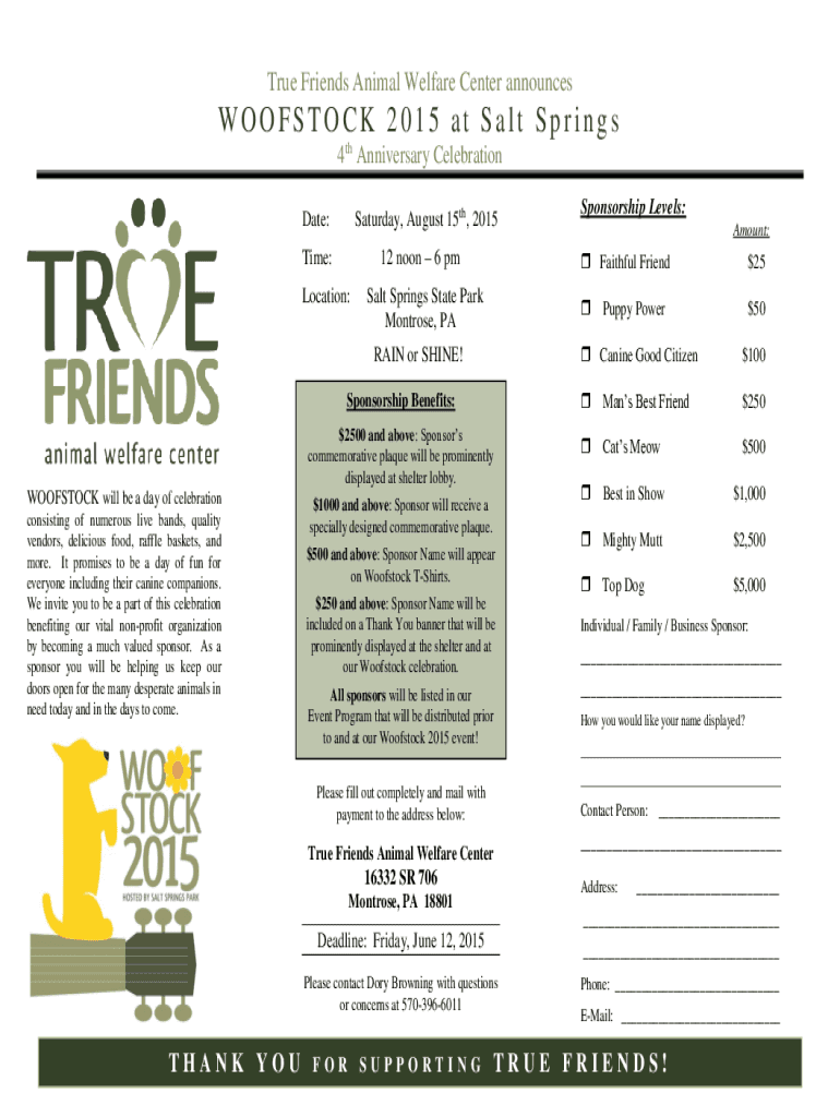 True Friends Animal Welfare Center announcesWOOFSTOCK 2015 at Salt Springs 4th Anniversary Celebration Saturday, August 15th, 2015Date:12 noon 6 time: Location:Salt Springs State Park Montrose, PA