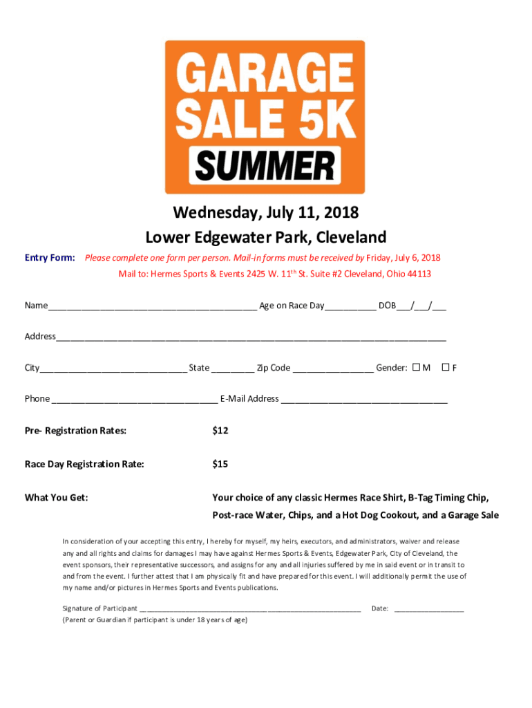 Wednesday, July 11, 2018, Lower Edgewater Park, Cleveland Entry Form: Please complete one form per person. Mailing forms must be received by Friday, July 6, 2018, Mail to: Hermes Sports & Events 2425