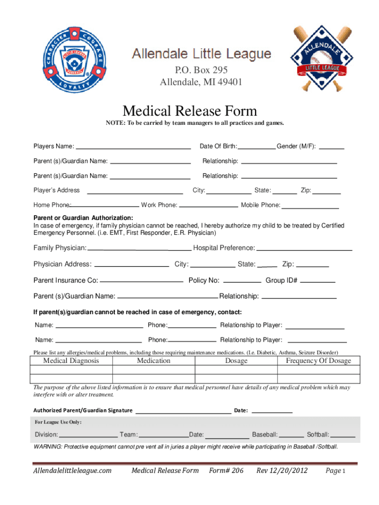 NOTE: To be carried by team managers to all practices and games. Players Name:Date Of Birth:Gender (M/F):Parent (s)/Guardian Name:Relationship:Parent