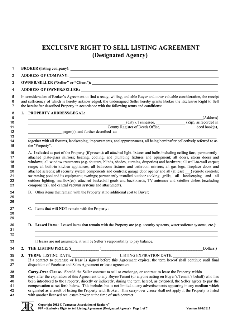 Get the free F87-2012-Exclusive Right to Sell Listing Agreement (Designated ...