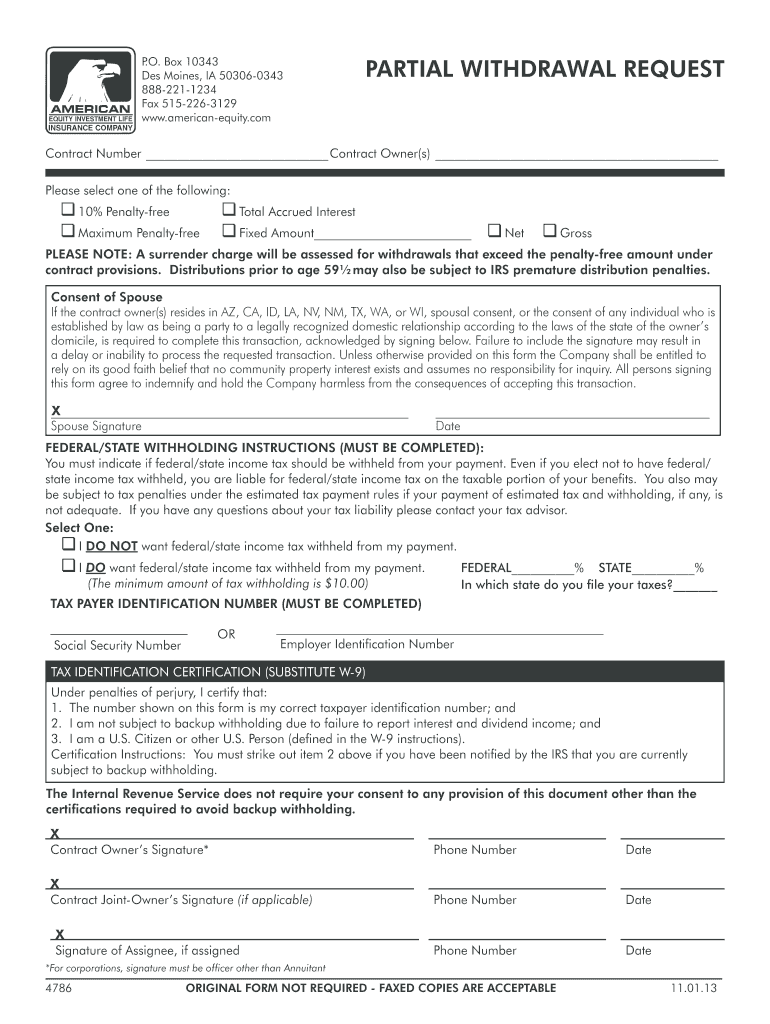 The Partial Withdrawal Request Form is a financial document used by contract owners to request a partial withdrawal from their contracts.