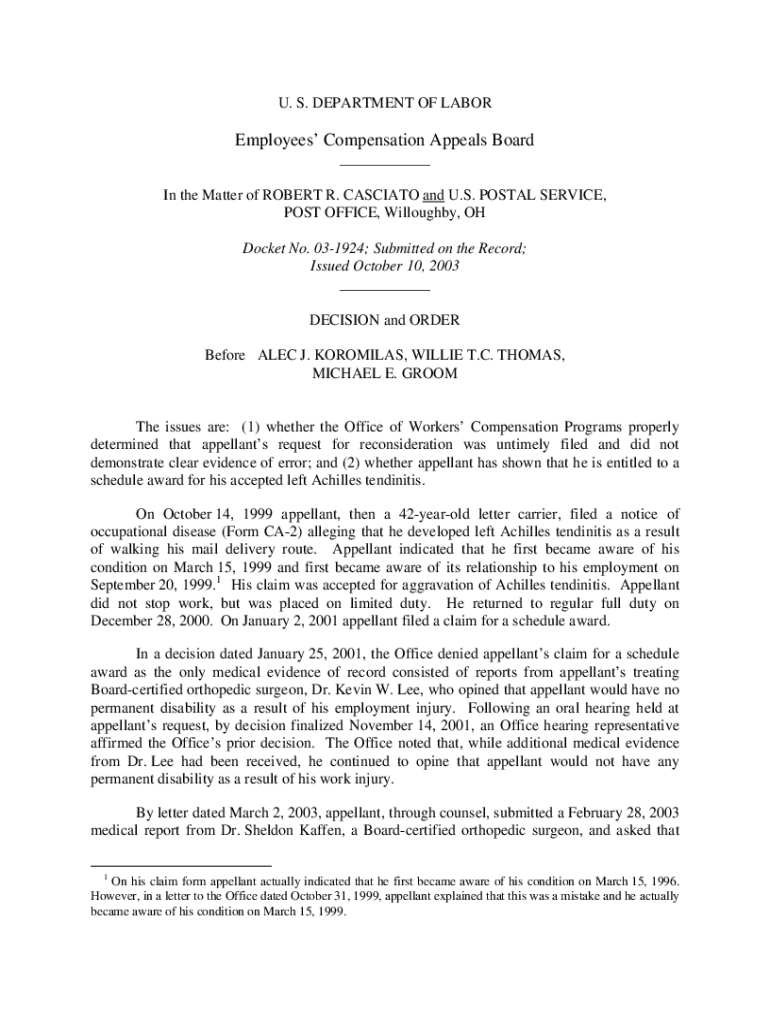 U. S. DEPARTMENT OF LABOREmployees Compensation Appeals Board In the Matter of ROBERT R. CASSIANO and U.S. POSTAL SERVICE, POST OFFICE, Willougbhy, OH Docket No. 031924; Submitted on the Record; Issued