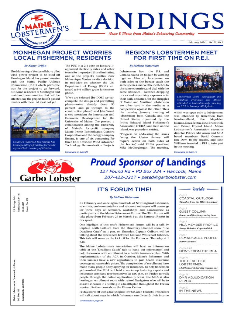 February 2014 Vol. 22, No. 2MONHEGAN PROJECT WORRIES LOCAL FISHERMEN, RESIDENTS By Nancy Griffin The Maine Aqua Venus offshore pilot wind power project to be sited off Mohegan Island has passed muster