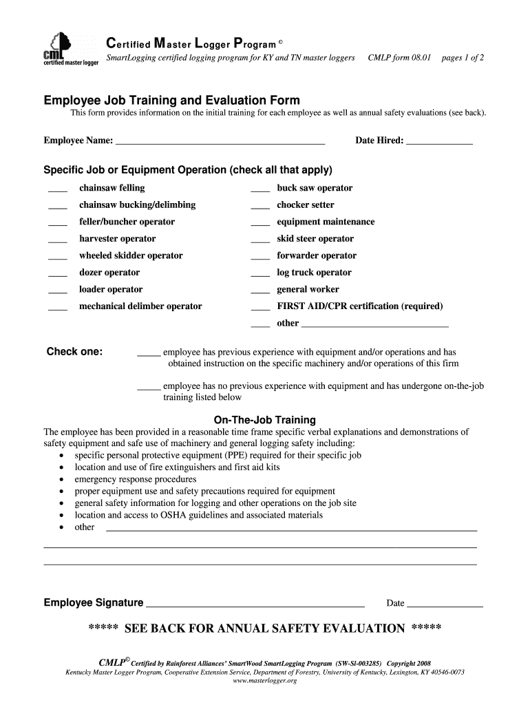 The Employee Job Training and Evaluation Form is a performance review document used by the Kentucky Master Logger Program to ensure employee training and safety evaluations in the logging industry.