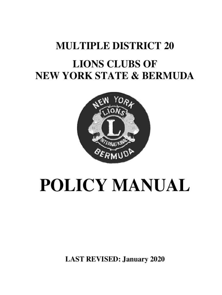 MULTIPLE DISTRICT 20 LIONS CLUBS OF NEW YORK STATE & BERMUDAPOLICY MANUALLY REVISED: January 2020PREFACE INTRODUCTION The contents of this manual, as published, constitute various procedures and policies