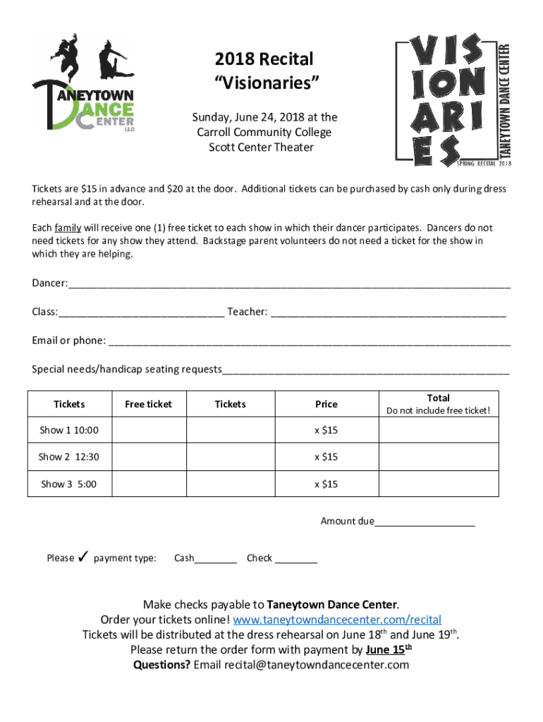 2018 Recital Visionaries Sunday, June 24, 2018, at the Carroll Community College Scott Center Theater Tickets are $15 in advance and $20 at the door. Additional tickets can be purchased by cash only
