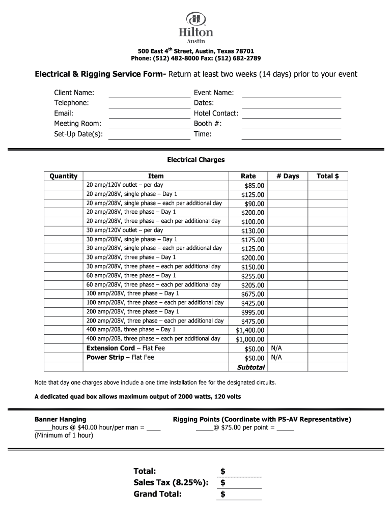 Key Features of the Hilton Austin Electrical & Rigging Service Form