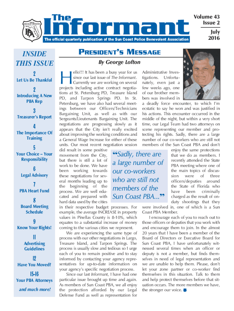 Volume 43 Issue 2POLICE BENEVOLENT ASSOCIATION S U N C O A ST The official quarterly publication of the Sun Coast Police Benevolent AssociationINSIDE THIS ISSUE 2 Let Us Be Thankful2 Introducing A