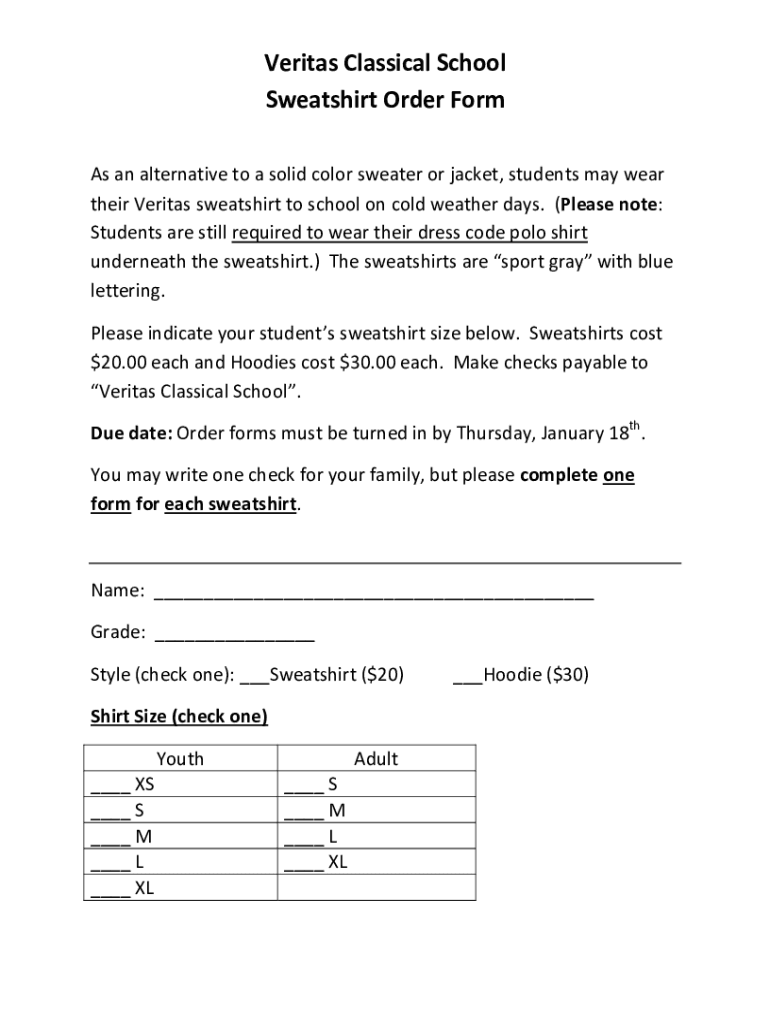 Get the free PDF Veritas Classical School Sweatshirt Order Form