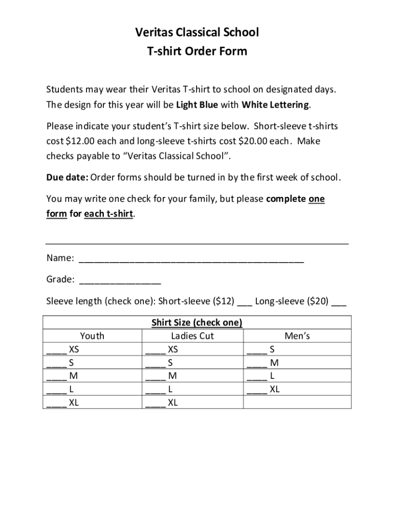 Get the free PDF Veritas Classical School T-shirt Order Form