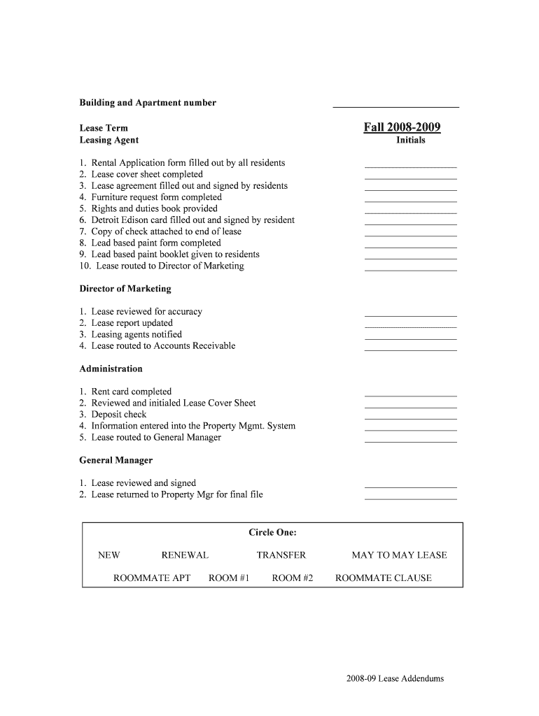 Building and Apartment number Lease Term Leasing Agent Fall 2008-2009 1. Rental Application form filled out by all residents 2. Lease cover sheet completed 3. Lease agreement filled out and signed