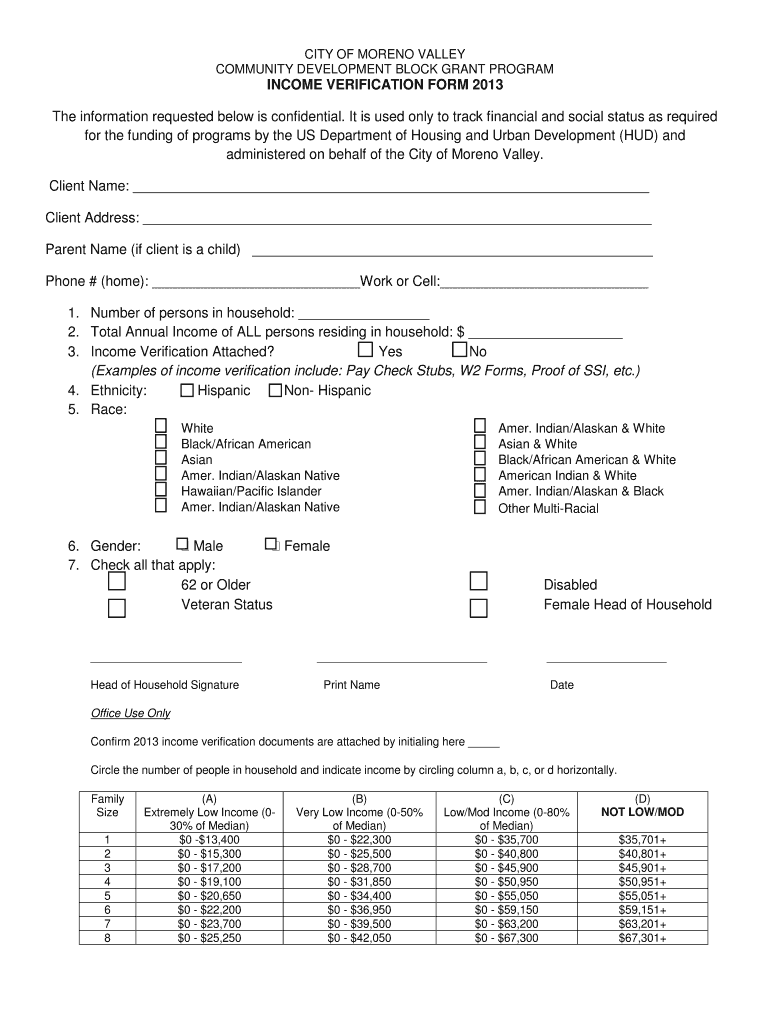 The Community Development Block Grant Income Verification Form is an income verification document used by residents in Moreno Valley to confirm eligibility for HUD-funded services.