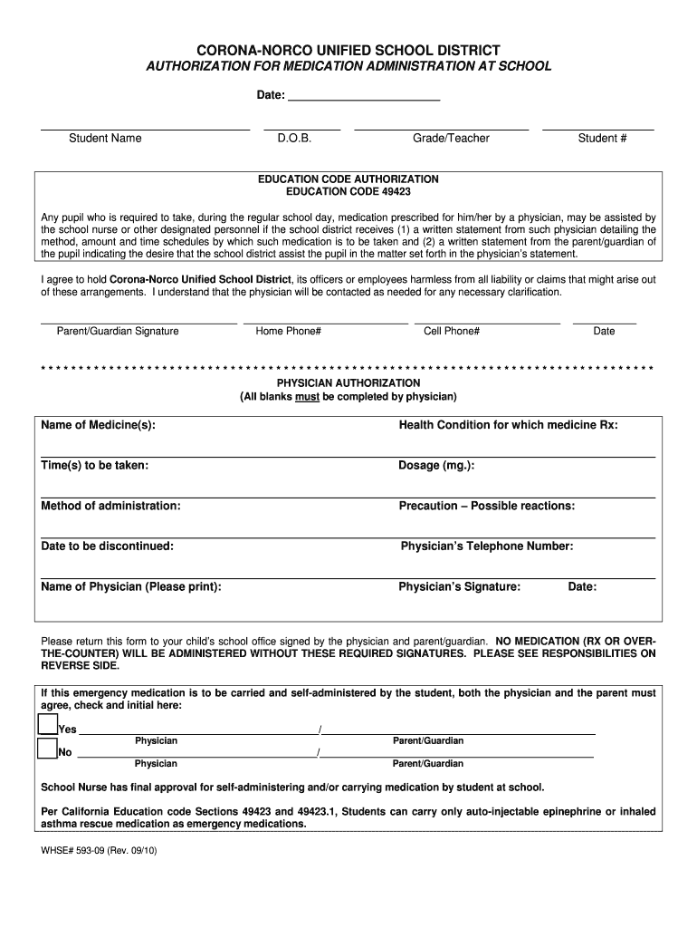 If the California Medication Authorization Form is not submitted, the school may not administer medication to your child, as they will not have the required authorization from the physician and parent/guardian.