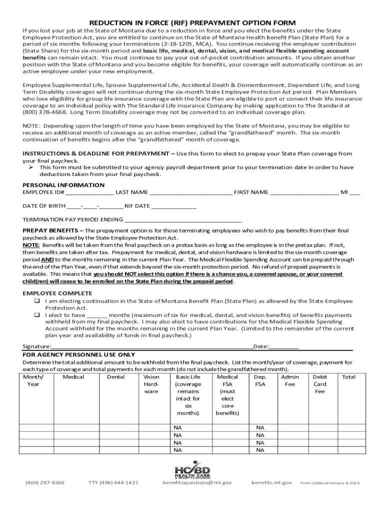 Get the free REDUCTION IN FORCE (RIF) PREPAYMENT OPTION FORM - benefits mt