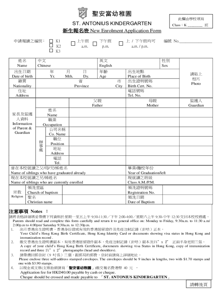 ST. ANTONIUS KINDERGARTEN New Enrollment Application Form NameK1 K2 K3 a.m. Chinese Date of birth Nationality Address Yr. p.m. / a.m. / p.m. English MTV. Dy. Province Name Occupation Co. Name Position