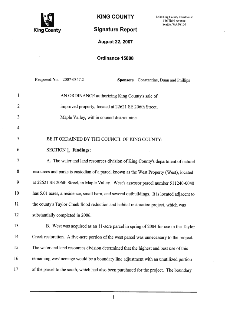 Tl KING COUNTY 1200 King County Courthouse 516 Third Avenue Seattle, W A 98104 Signature Report August 22, 2007, Ordinance 15888 Sponsors Constantine, Dunn and Philips Proposed No. 2007-0347.2 1 AN