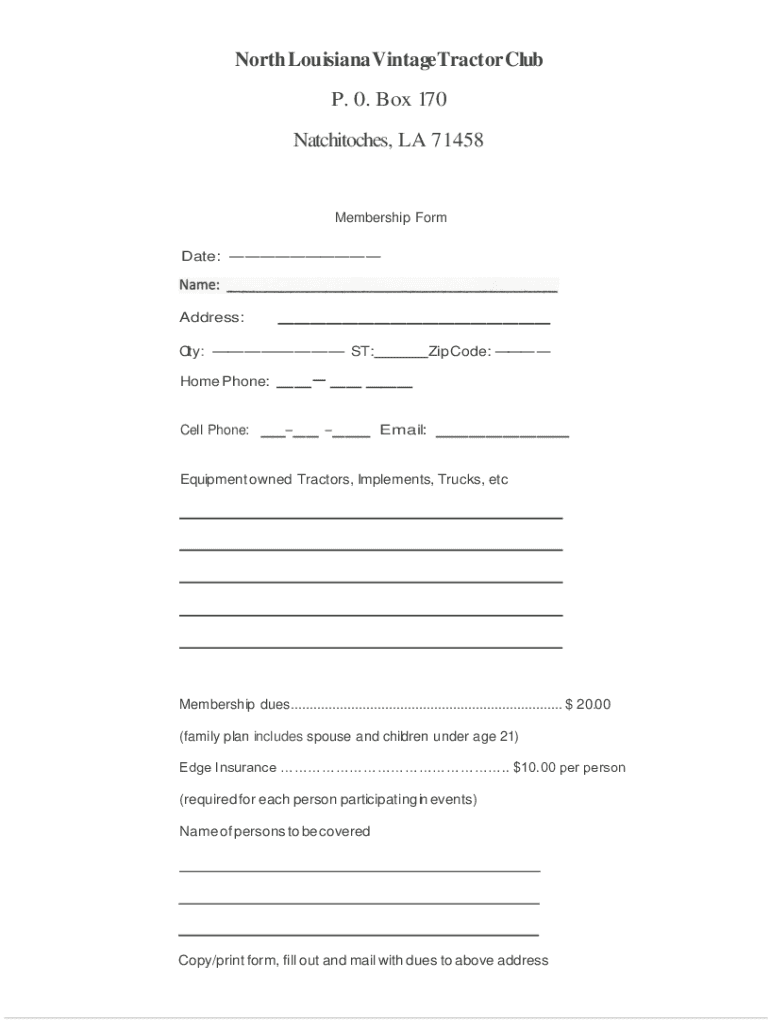 North Louisiana VintageTractor Club P. 0. Box 170 Natchitoches, LA 71458Membership Form Date: Address:City: ST: Home Phone:Cell Phone:Zip Code: Email: Equipment owned Tractors, Implements, Trucks,