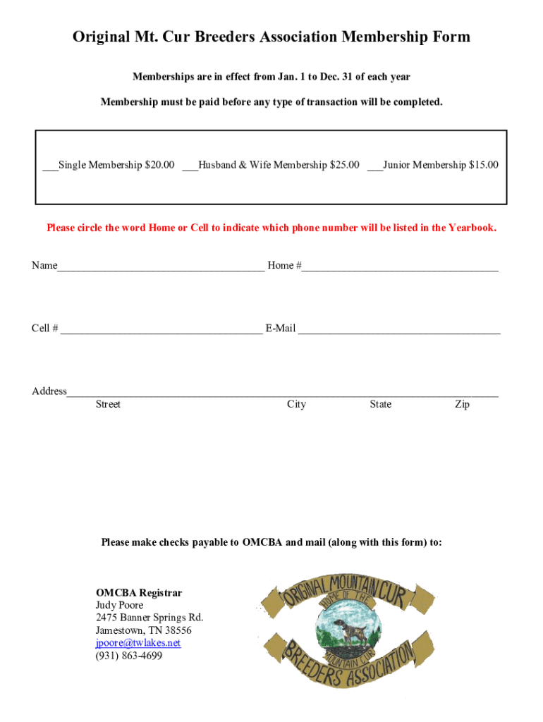 Original Mt. Cur Breeders Association Membership Form Memberships are in effect from Jan. 1 to Dec. 31 of each year Membership must be paid before any type of transaction will be completed. Single