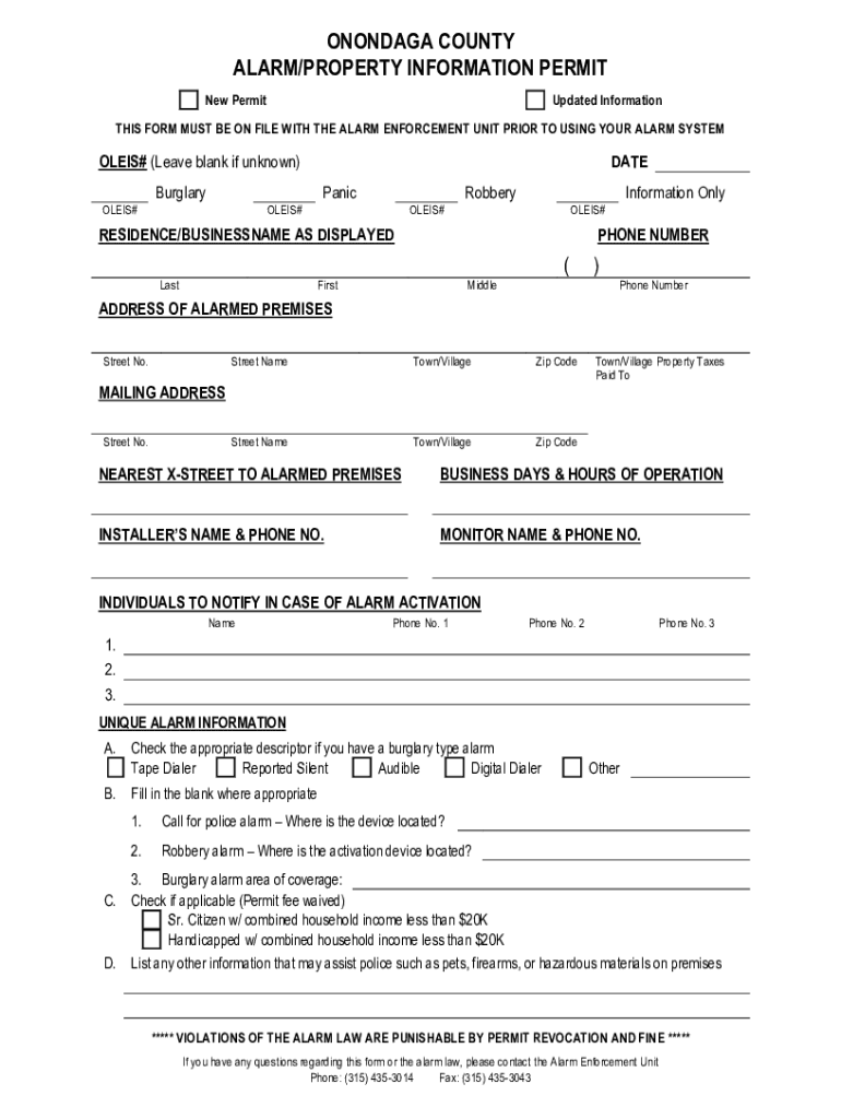 New PermitUpdated InformationTHIS FORM MUST BE ON FILE WITH THE ALARM ENFORCEMENT UNIT PRIOR TO USING YOUR ALARM SYSTOLES# (Leave blank if unknown)