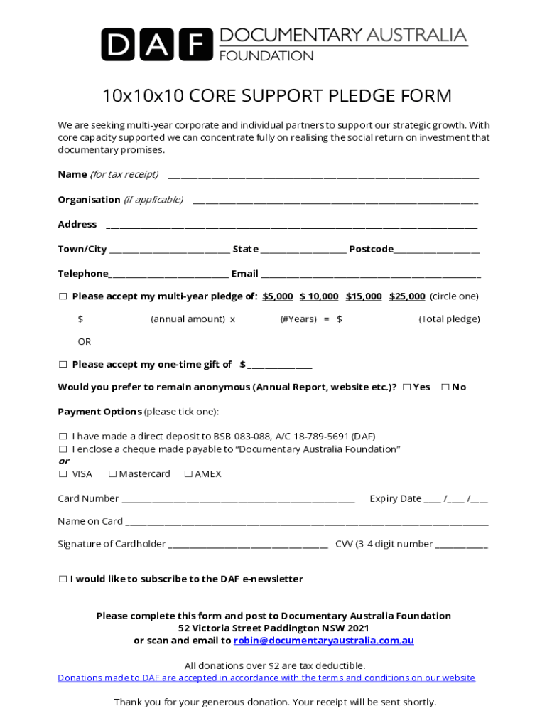 10×10×10 CORE SUPPORT PLEDGE FORM We are seeking multiyear corporate and individual partners to support our strategic growth. With core capacity supported we can concentrate fully on realizing the