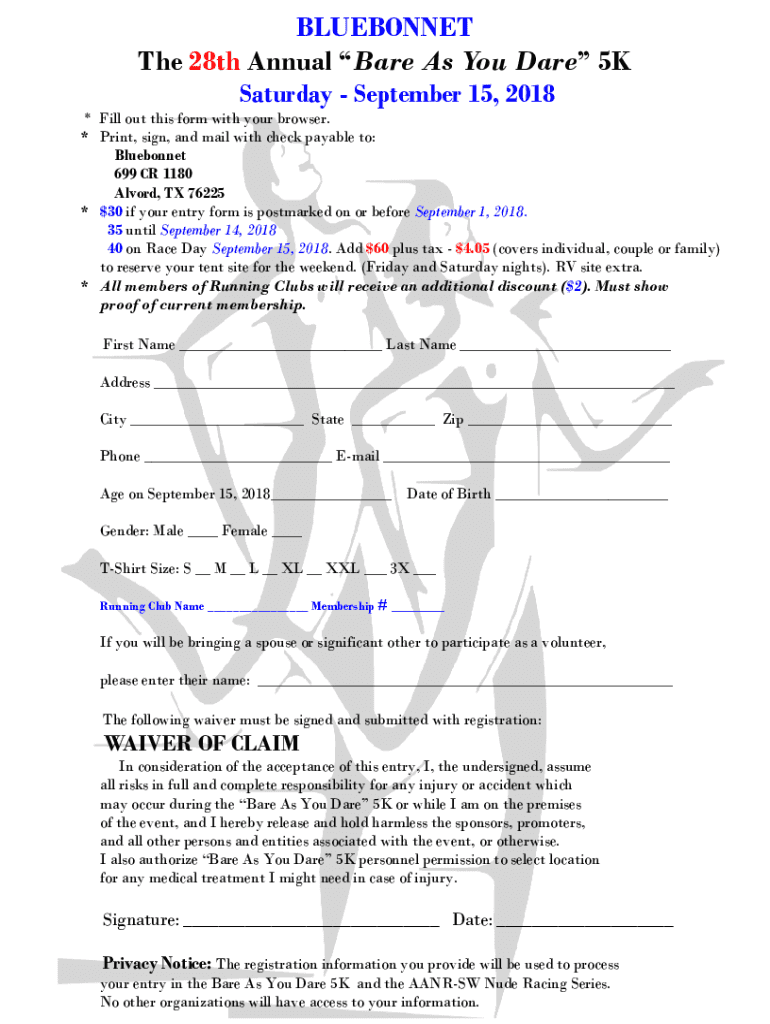 BLUEBONNET The 28th Annual Bare As You Dare 5K Saturday, September 15, 2018 * Fill out this form with your browser. * Print, sign, and mail with check payable to: Bluebonnet 699 CR 1180 Alford, TX