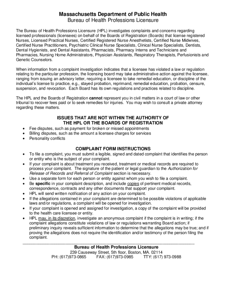 The Bureau of Health Professions Licensure (HPL) investigates complaints and concerns regarding