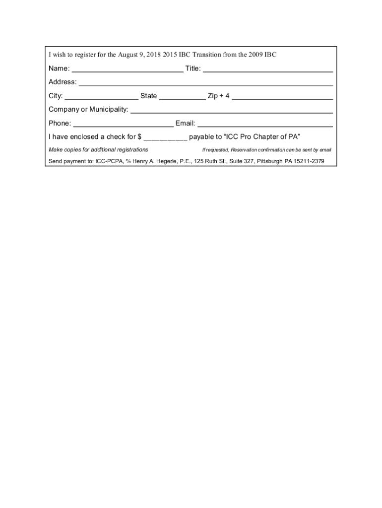 I wish to register for the August 9, 2018 2015 IBC Transition from the 2009 IBC Name:Title:Address: City:State + 4Company or Municipality: Phone:Email:I have enclosed a check for $ payable to ICC