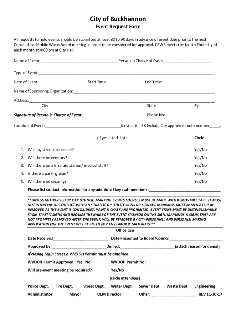To fill out the City of Buckhannon Events form, provide detailed information about the event including its name, date, time, location, organizer details, and a brief description.